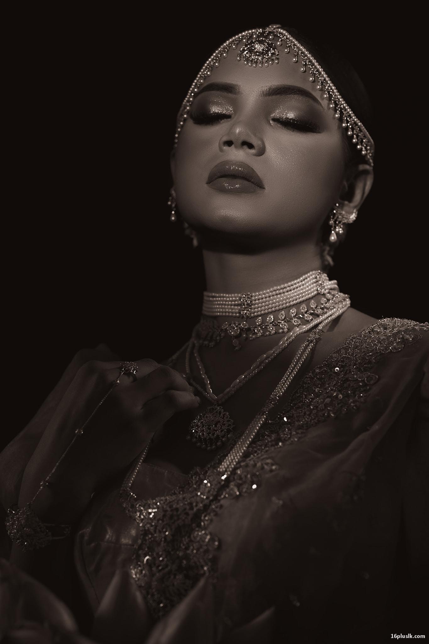 Samuel Hasini, depicted as a Sri Lankan Kandyan bride, embodies elegance and cultural richness through her bridal attire and exquisite jewelry. Her beauty is striking, with a captivating gaze that draws the viewer in. Her eyes are beautifully accentuated with expertly applied makeup, enhancing her natural features and adding a touch of glamour. The contours of her face are highlighted by her flawless complexion, contributing to her regal appearance. The photographs capture her in various poses, each one showcasing a different facet of her grace and poise.
